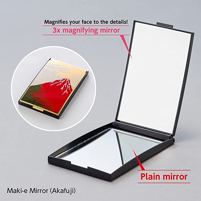 HORIUCHI MIRRORは、くすみの原因となる鉄分をより多く取り除いた透明度の高いガラスと、色の再現性が高い反射金属との組み合わせにより、本来の姿をありのままに映し出す日本で特許を取得した鏡です。肌の色が鮮明に映ることで、自分に合ったファンデーションの色味がわかり、メイクの仕上がりが格段よくなるため、美容業界のプロの方々にも支持されています。 Maki-e Mirror 日本の伝統工芸、蒔絵を施したミラー 蒔絵は日本独自に発達した漆芸の代表的な技法で1200年ほど前から行われています。器の表面に細い筆を使って漆で絵を描き、その漆が固まらないうちに上から金の粉を蒔きつけて模様をあらわします。蒔いて絵にするという意味から蒔絵といいます。蒔絵は400年も前からヨーロッパなどに輸出されており、今でも外国では「Maki-e」と呼ばれて知られています。 その蒔絵を施した等倍鏡と3倍拡大鏡がセットになったコンパクトミラー。薄くて軽いので持ち運びにも便利です。3倍拡大鏡は湾曲率600rのモデル。細部まで大きく見えて角栓・シミ・シワなどお肌のお手入れに最適です。日本の伝統工芸とメイクミラーが融合した商品です。 サイズ 7.8×12.5×1cm 重量約110g 素材 ABS樹脂・ガラスミラー 日本製