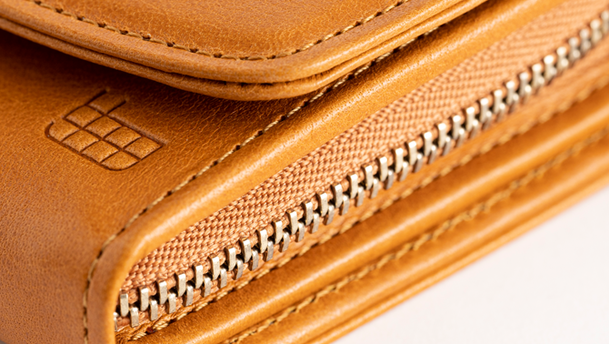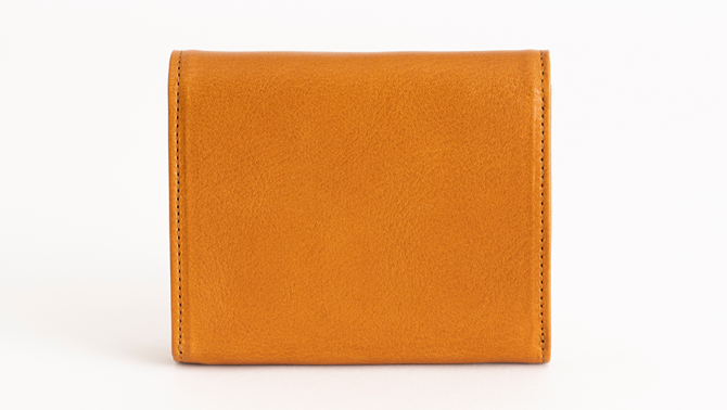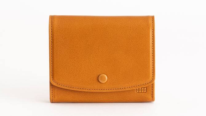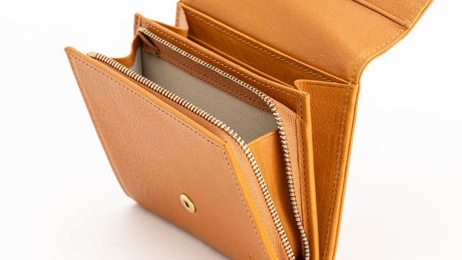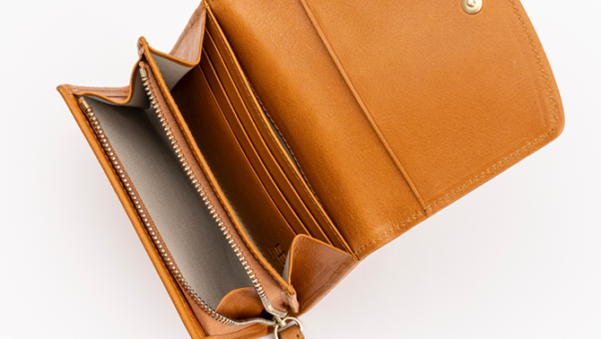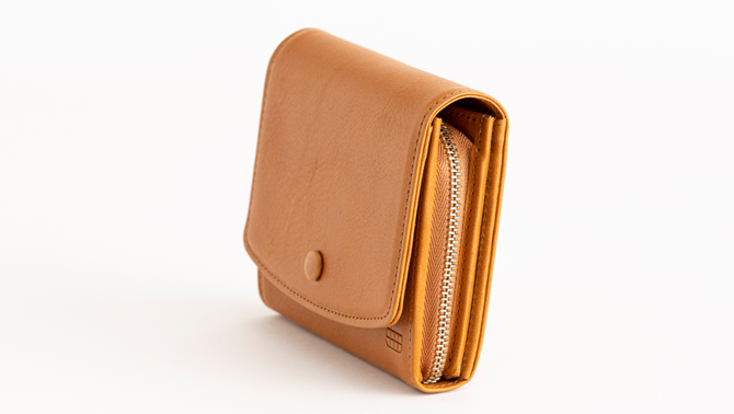 留め具を革で包んだクルミボタンが特徴的な財布。
