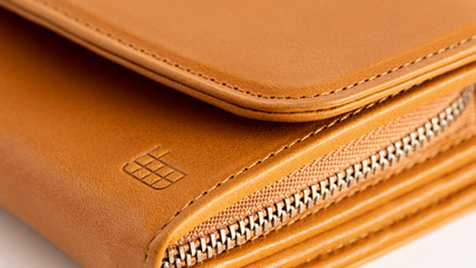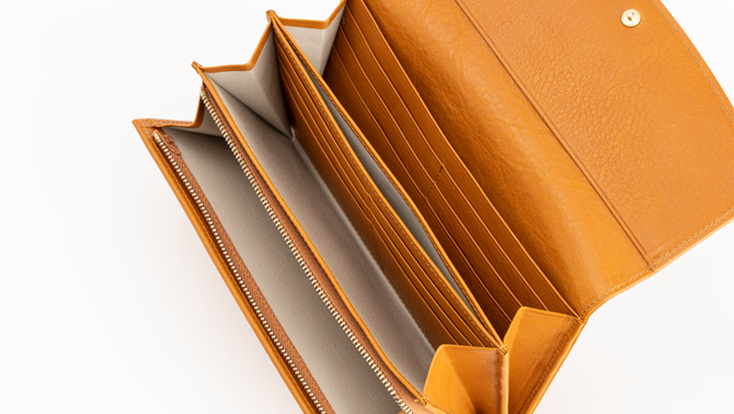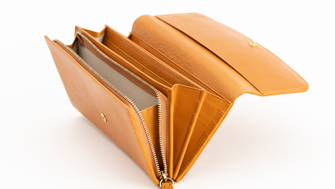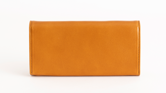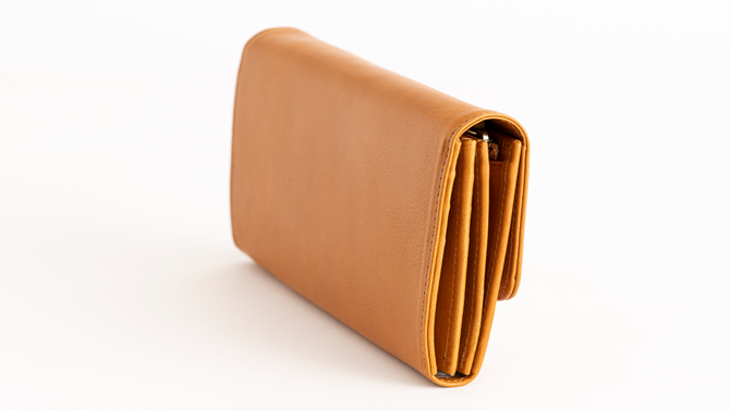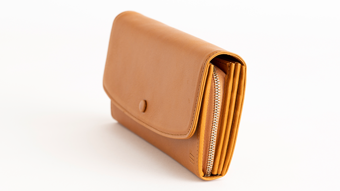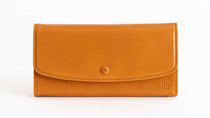 This long wallet features a walnut button with a leather-wrapped clasp.