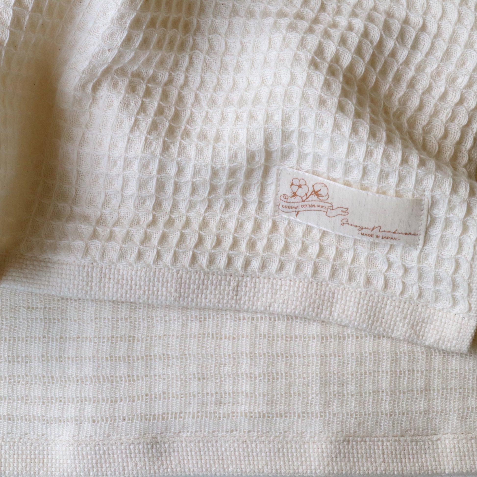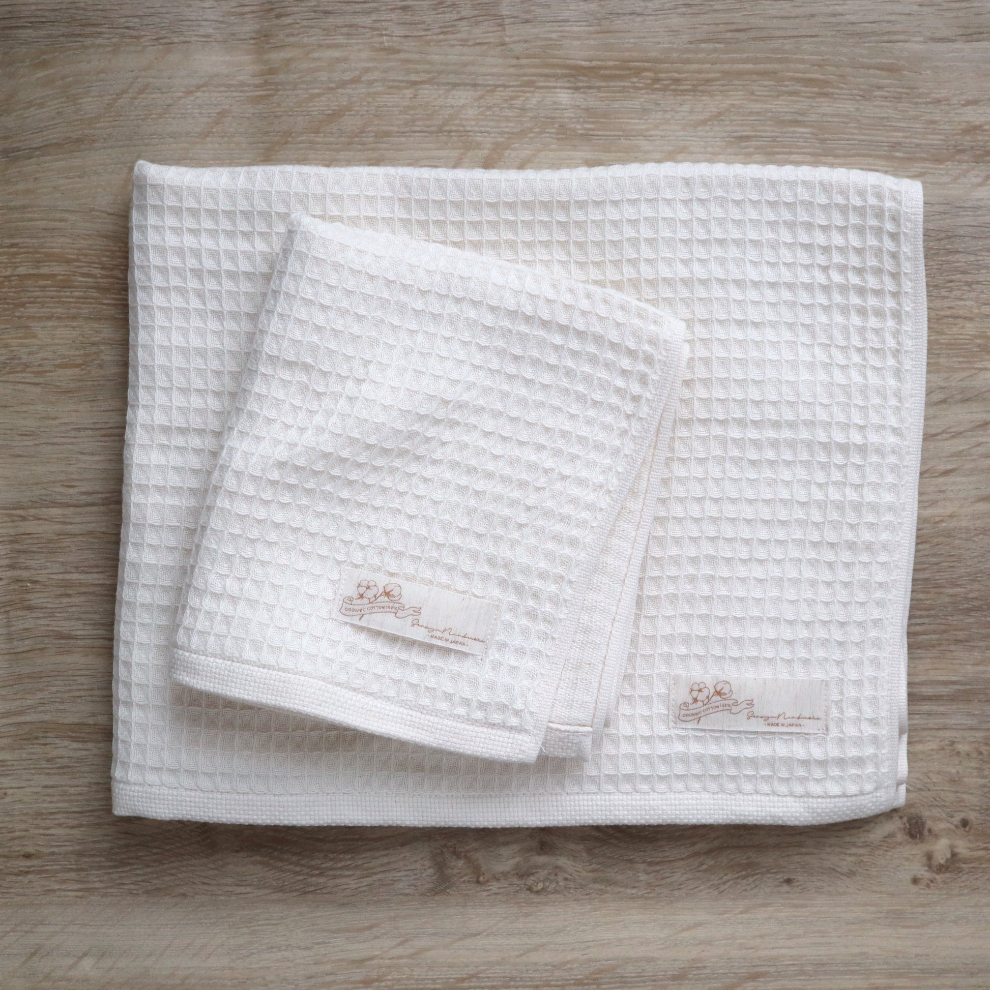 外層材質為四邊形凹凸不平(華夫格編織),內里為粗紗編織而成的薄且柔軟親膚的毛巾。