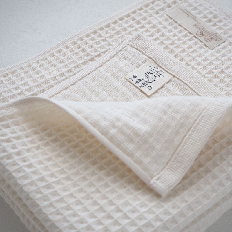 外層材質為四邊形凹凸不平(華夫格編織),內里為粗紗編織而成的薄且柔軟親膚的毛巾。