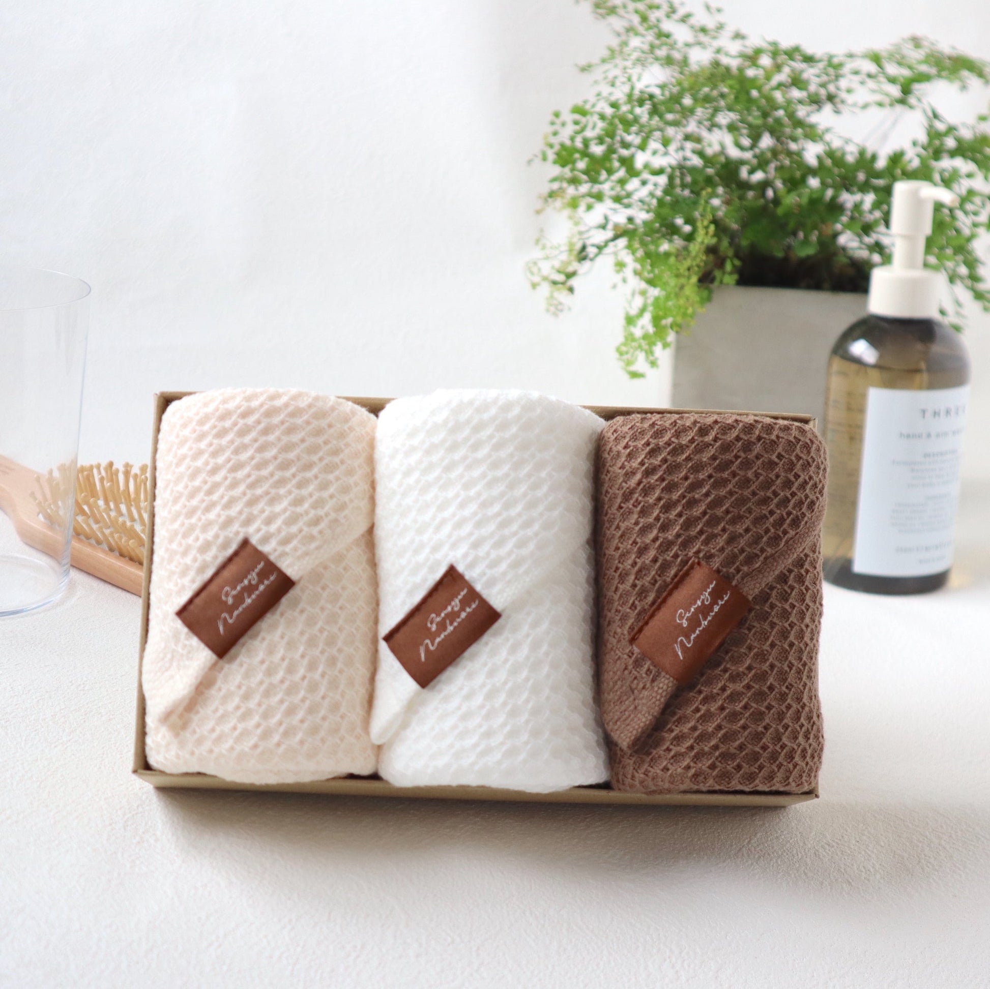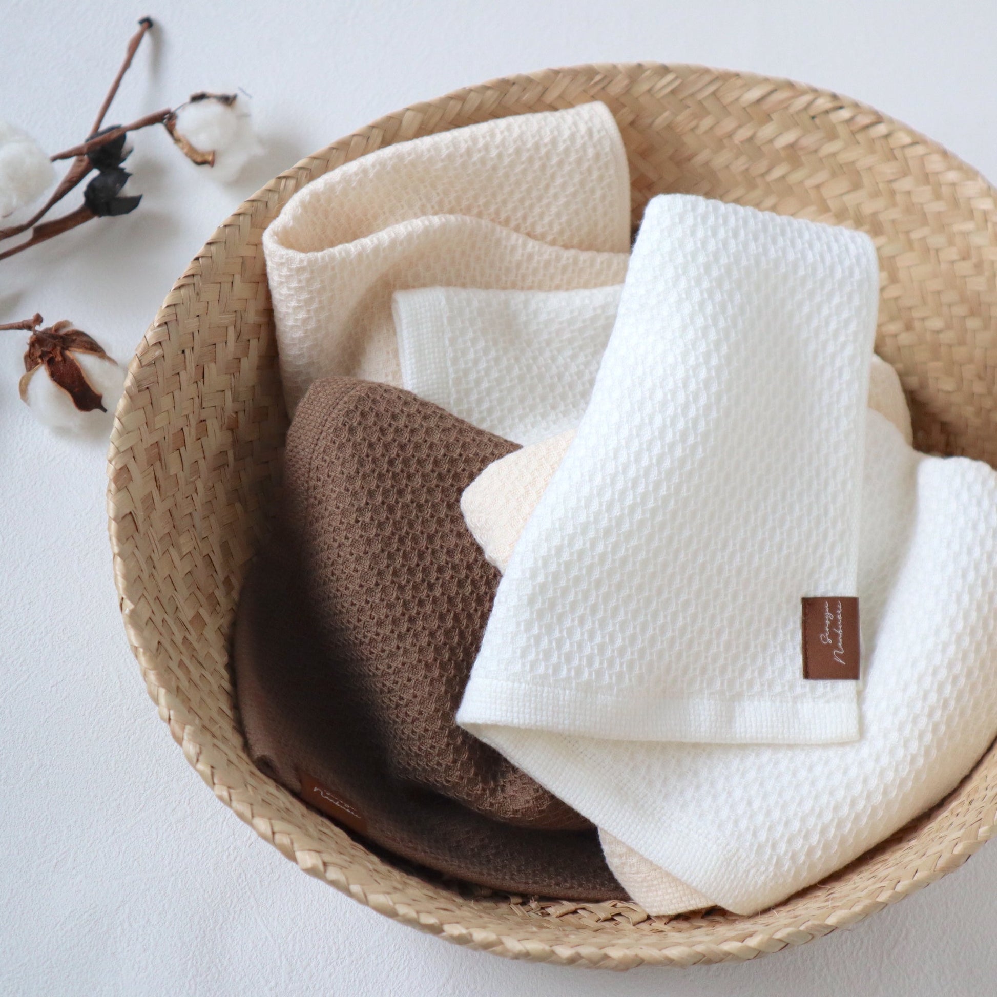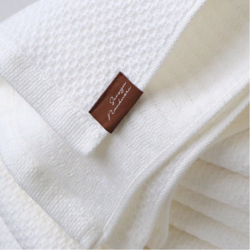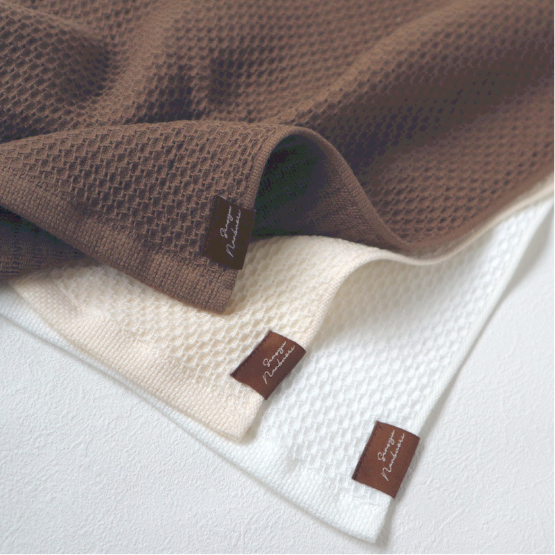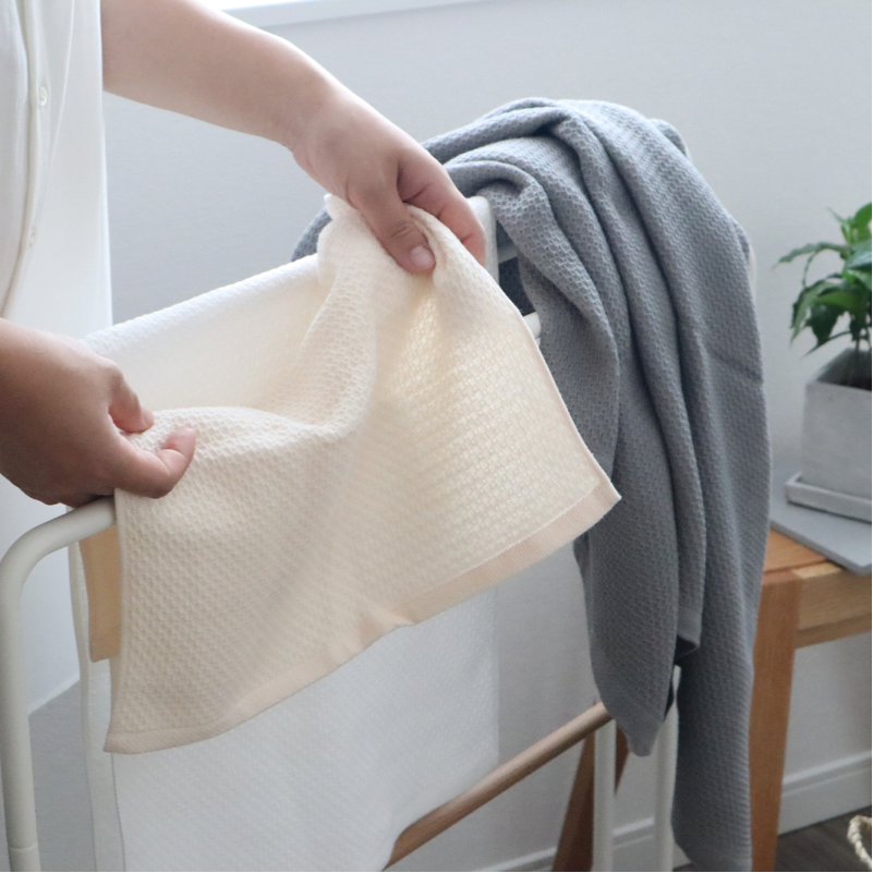 正面編織六邊形凸點(蜂窩編織),背面編織粗紗,具有輕薄而柔軟的觸感。兩層結構,柔軟蓬鬆,透氣性極佳,幹得快,隨時可用乾淨。洗臉、手巾、外出時手帕都很方便。大阪製造認證產品。