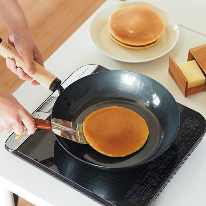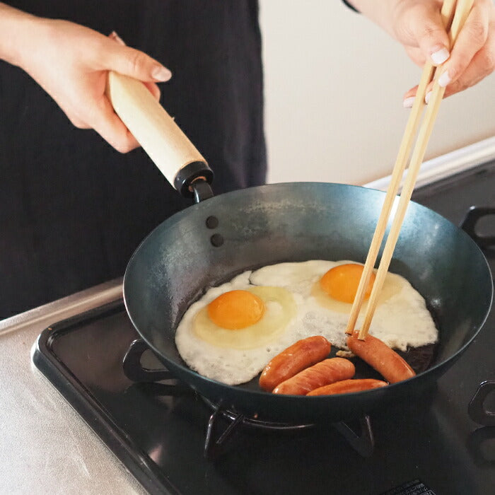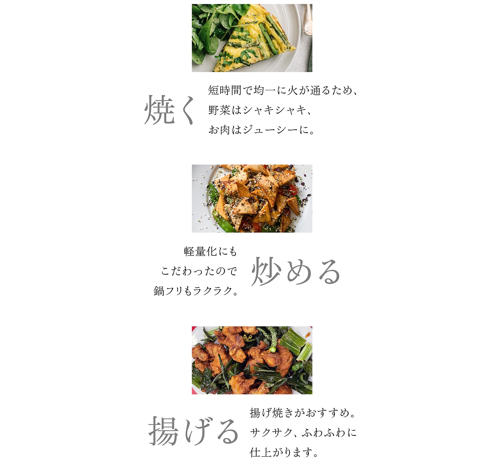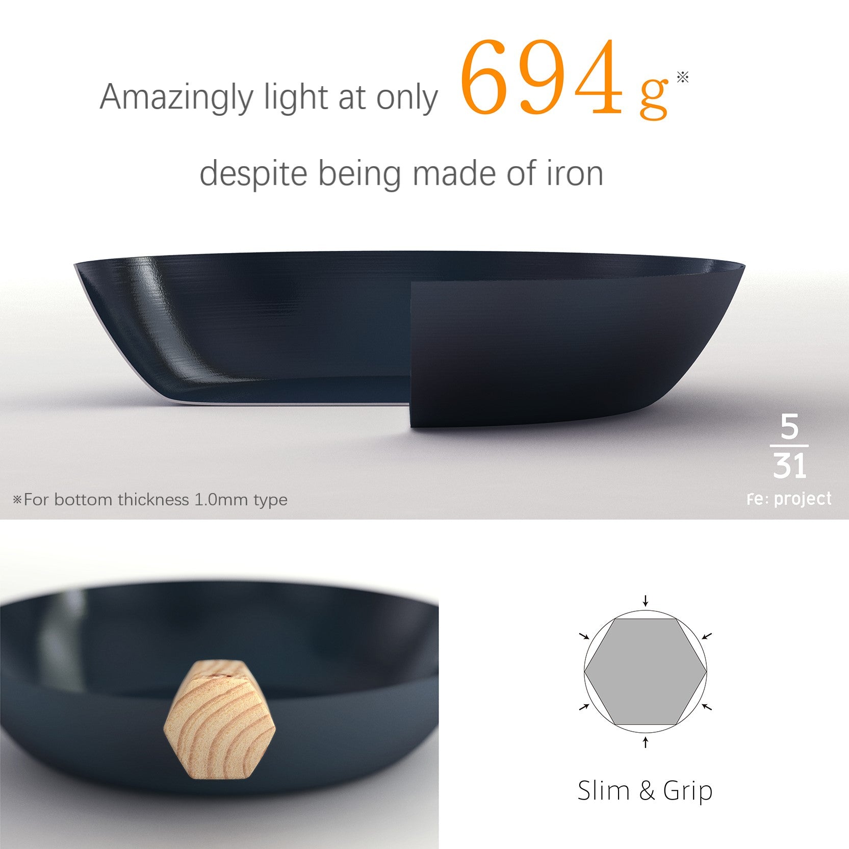 經過反复的原型製作,我們成功地將平底鍋做得盡可能薄,底部厚度為 1mm,側面厚度為 1mm。雖然是鐵製的,但重量只有 694g。避免了鐵煎鍋的弱點。