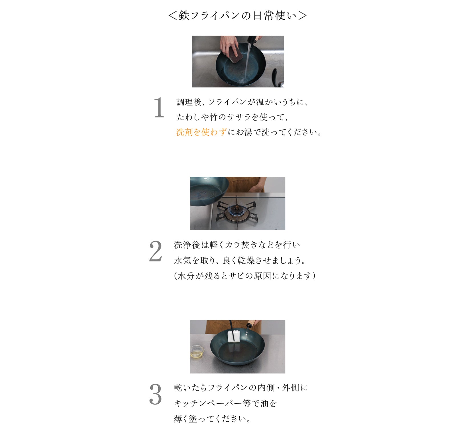 鐵質煎鍋在使用初期所必需的步驟(開鍋和油調理)被納入製造過程,由工匠們一一手工完成。顧客從購買之日起就可以立即使用他們的鐵煎鍋(無需開鍋)。
